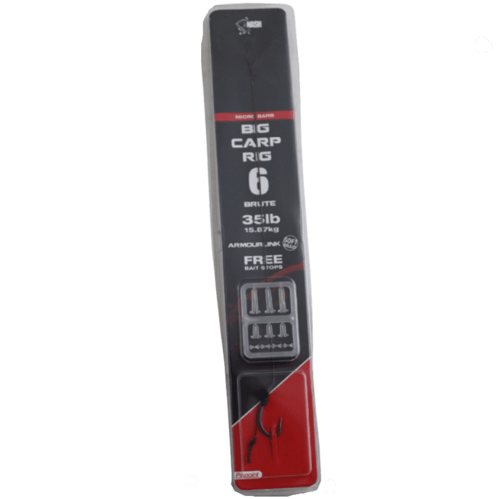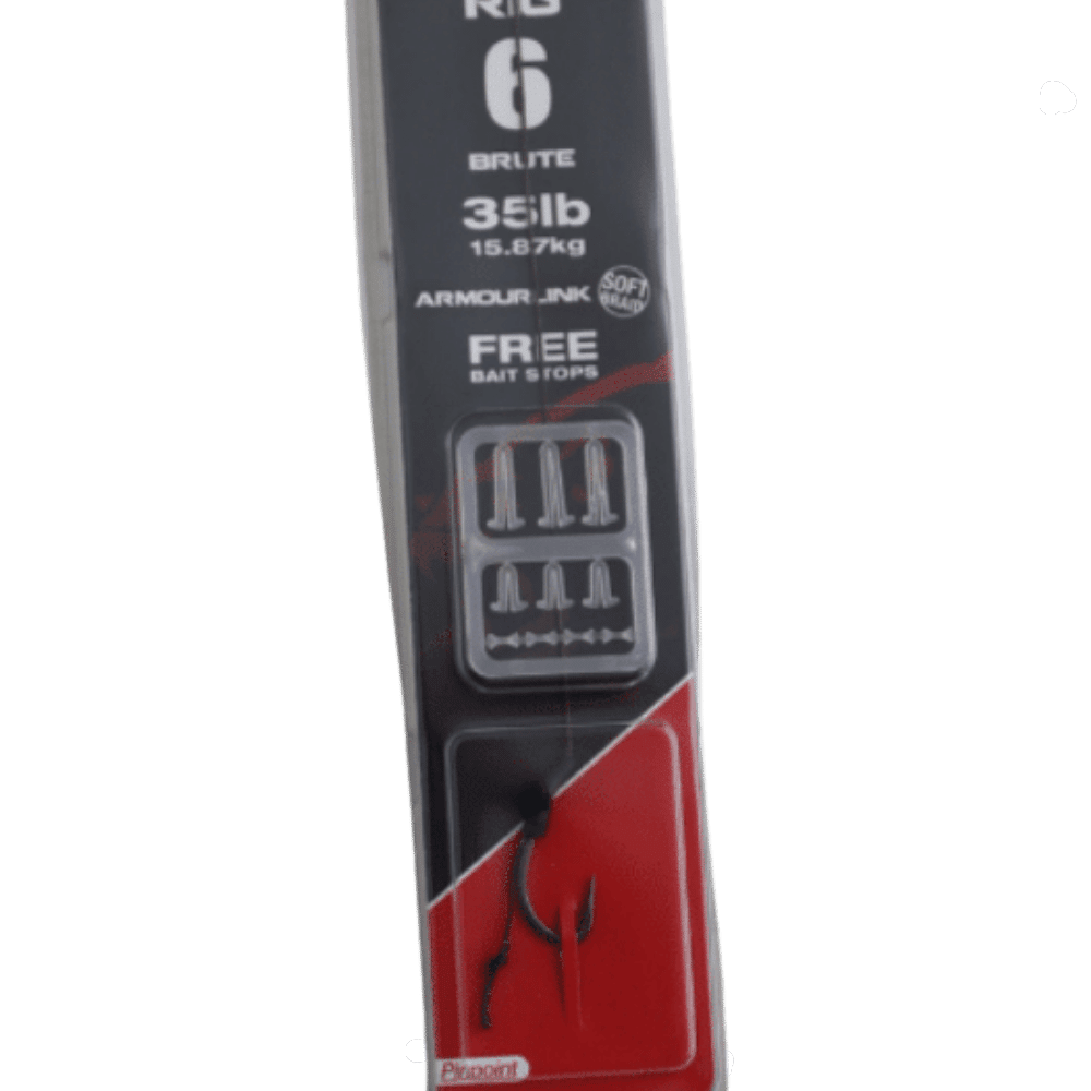Der unfassbar starke Pinpoint „Brute“ Haken in Kombination mit dem extrem abriebfesten Armourlink-Vorfach-Material. Für herausfordernste Situationen und allergrößte Karpfen, ganz ohne Kompromisse. Schlaufen-Achterknoten für bequemes Wechseln des Rigs. Inklusive drei Größen Stopper (je 3 Stück) für unterschiedliche Köder-Durchmesser.