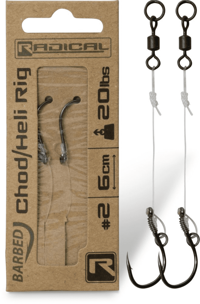 In den letzten Jahren erlebte das Chod Rig / Heli Rig eine wahre Renaissance, deshalb darf es im Angebot von Radical einfach nicht fehlen. Eine solche Montage kann auch in schlammigen Seen mit starkem Krautwuchs gefahrlos platziert werden. Ein sofort einsatzbereites Rig in 6 Zentimetern Länge, gebunden aus Chod-Filament-Vorfachmaterial mit einem speziellen Choddy-Haken.